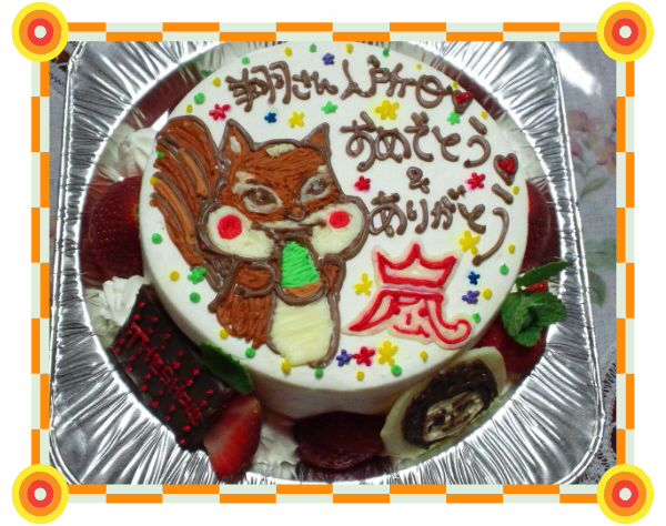お友達とケーキでお祝いしちゃいました♪ 翔さんがリスに似ているので… リスさん&嵐さんマーク(赤) THE SHOW タオルのチョコと Miiの翔さんのチョコ ケーキのデザインは私が考え… いつもお願いしているケーキ屋さんで作ってもらいました♪ ちょと若いころ(10年くらい前)の嵐さんの映像なんかを観ながら… まだ、今みたいに上手にしゃべれないし… 完成されていない感じがたまらなく愛おしい☆☆ 昔の嵐さんは、「ファンが支えてあげなきゃー」的な母性本能をくすぐられる感満載のような… 今の嵐さんは「ファンが支えなくても、世間のみなさんが支えるから大丈夫なんじゃないだろーか?」なんてちょっぴりさみしい気持ちもしないでもない。 …なんてわがままな。 いいんです☆ 彼らの存在自体に…私は支えられているのです♪ 翔さんも10月22日は大切に思っているかな? 今日、17年前のこと思い出したかな? 去年はしやがれが10月22日に放送あって その話してたもんねーー 今日のZEROはちょっとトクベツな気持ちで観ちゃうかもね^^